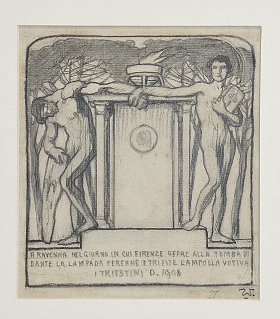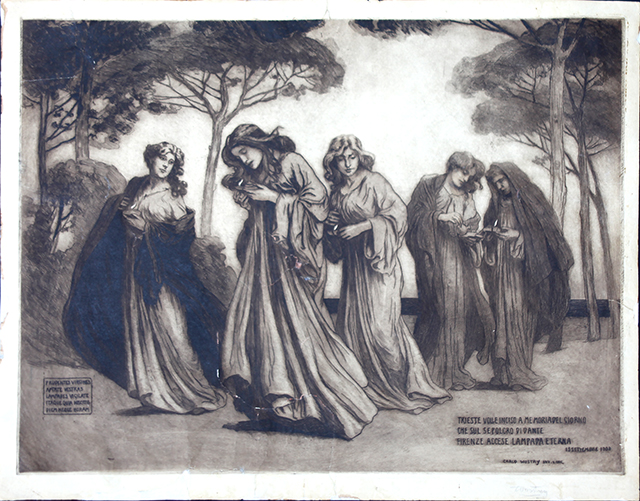 Per accompagnare il dono dell’Ampolla da parte di Trieste alla Tomba di Dante a Ravenna nel 1908, il pittore triestino Carlo Wostry realizzò un’incisione all’acquaforte, ispirata all’opera di Giovanni Mayer. Rifacendosi alla Parabola delle dieci Vergini (Mt 25, 1-12) vi sono riprese le cinque vergini prudenti – simbolo delle province irredente: Trieste, Trento, Gorizia, Istria e Dalmazia – che, in devoto sospiro, stringono in mano le simboliche lucerne. Le fanciulle formano – entro una cornice di pini marittimi – un corteo da cui spicca la figura in primo piano. I panneggi morbidi delle vesti e le delicate movenze ricordano lo stile figurativo dei pittori preraffaelliti, accostato ai grafismi e alle sinuosità del Liberty.