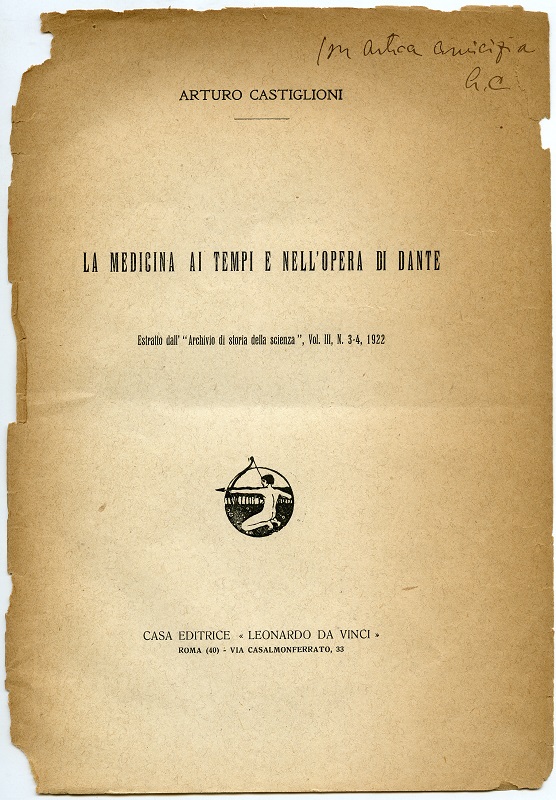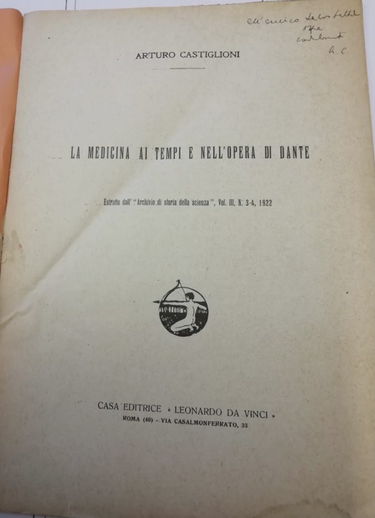 Nei suoi scritti Dante descrive le malattie con una proprietà di linguaggio che rivela una sorprendente familiarità con la medicina. Presso il fondo Sabbadini della Biblioteca dei Civici Musei di Storia ed Arte si conserva il saggio “La medicina ai tempi e nell’opera di Dante” del triestino Arturo Castiglioni (1874-1953). L’autore espone il testo, nell’ambito delle celebrazioni dantesche della Società di Minerva, il 19 dicembre 1921.