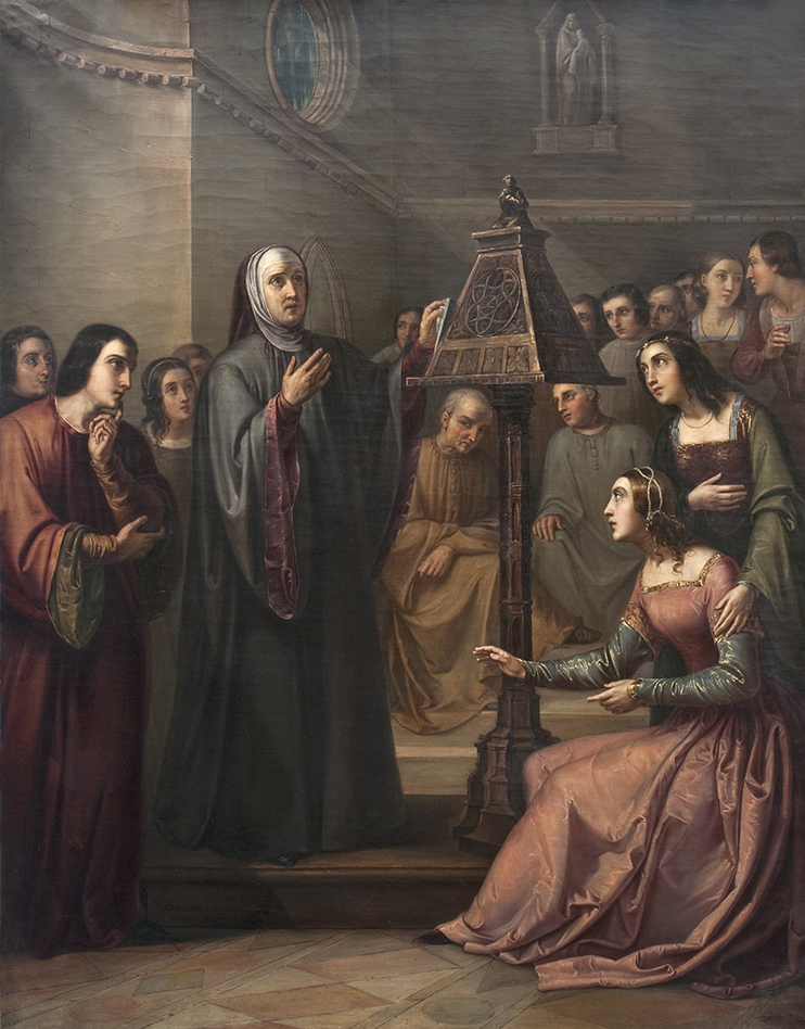 La scena si svolge nella chiesa di Santo Stefano a Firenze. Nello stretto spazio è ritratto un gruppo di persone che circonda una figura dallo sguardo ispirato, Boccaccio, con gli occhi rivolti al cielo, le labbra socchiuse, la mano destra tesa, mentre con l’altra sfoglia un libro appoggiato ad un leggio ligneo intarsiato. Sebbene non incoronato dalla consueta corona d’alloro, che l’iconografia riconosce a Boccaccio a Dante e a Petrarca, si è giunti all’identificazione in Boccaccio perché fu incaricato dalla municipalità di Firenze di dar lustro all’Alighieri, quando ormai il sommo poeta era morto e il suo corpo sepolto lontano dalla città natale: Firenze gli aveva voltato le spalle, confiscato i beni ed esiliato. Boccaccio, più giovane di Dante di una quarantina d’anni, scrisse il Trattatello in Laude di Dante, una prima biografia del poeta e aggiunse “divina” alla Commedia dantesca.