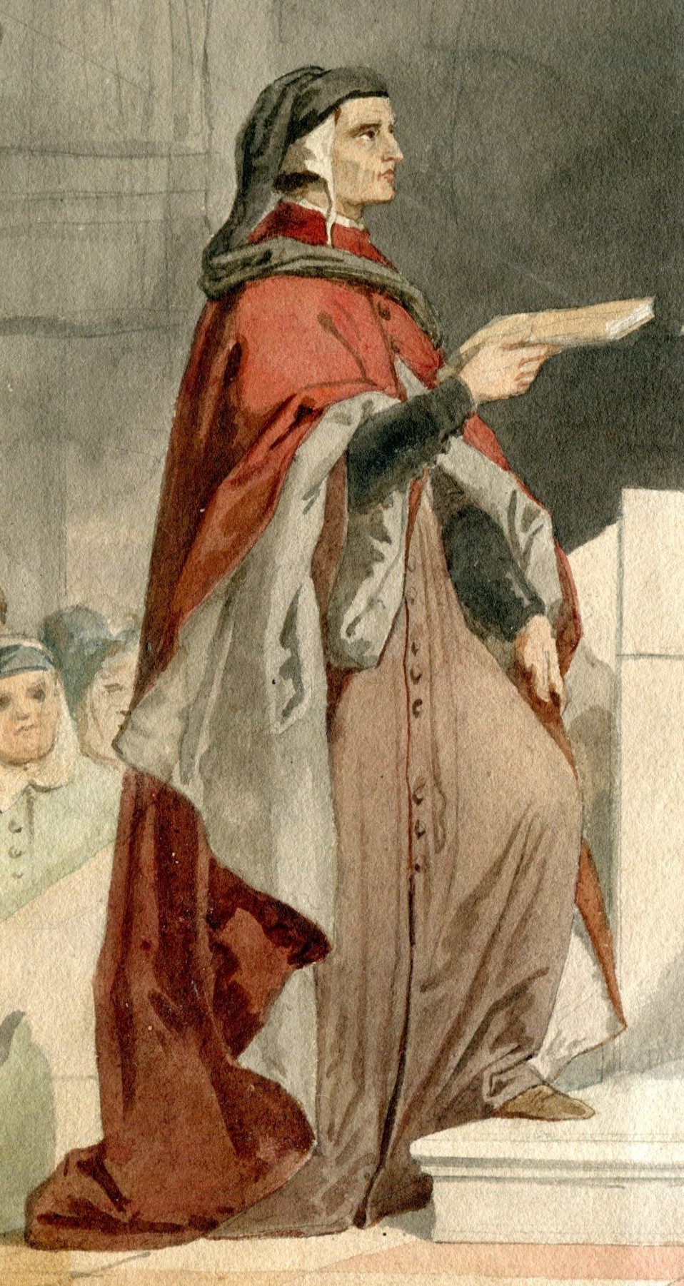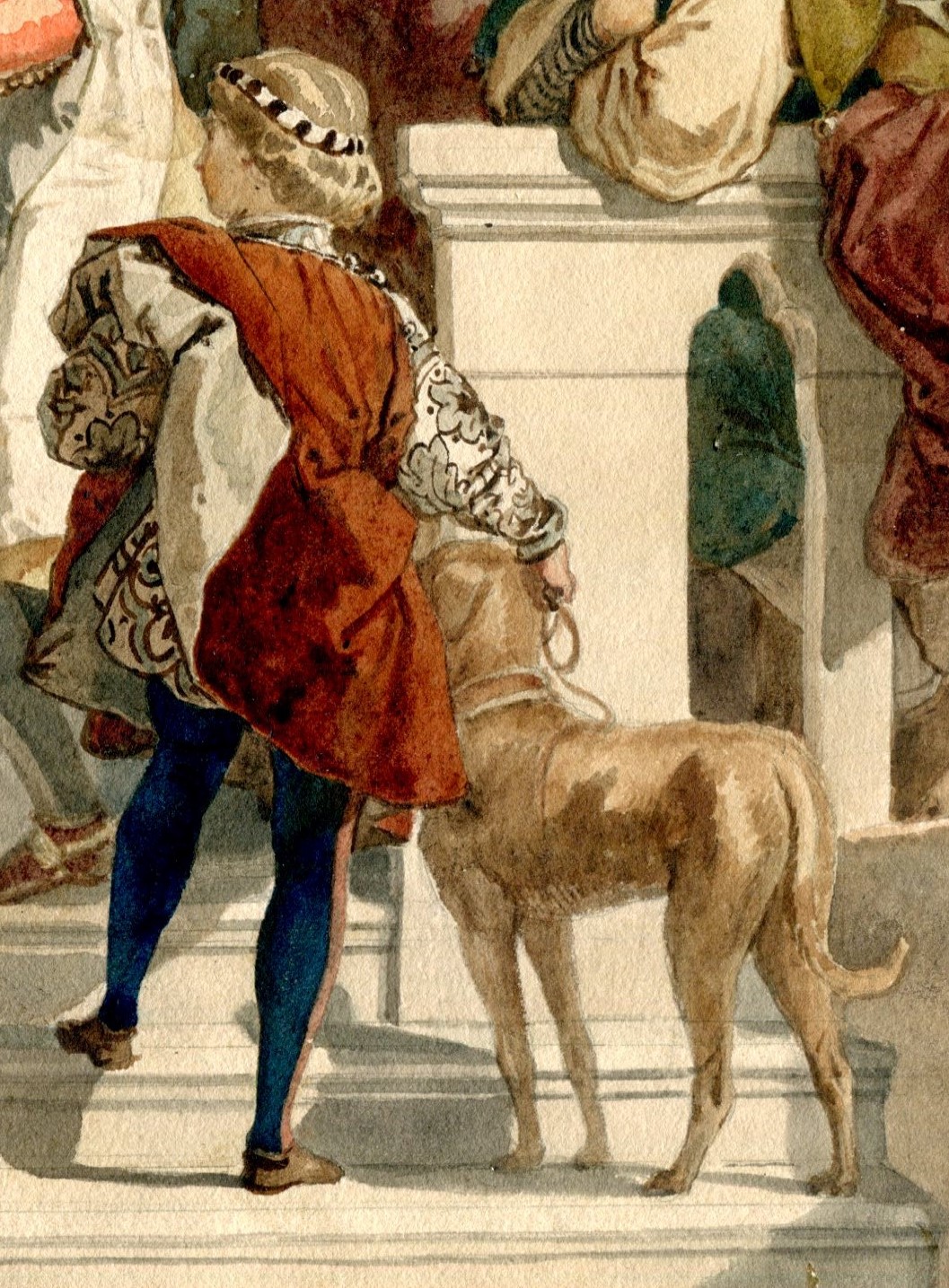 Nell’acquerello finito di Gatteri, l’immagine del giovane signore di Verona sembra pienamente rispecchiare tali virtù. Nella profusione dei magnifici dettagli degli abiti medievali, minuziosamente riprodotti da Gatteri, Dante porge a Cangrande il volume prezioso a lui dedicato, con espressione visibilmente ammirata e fiduciosa.