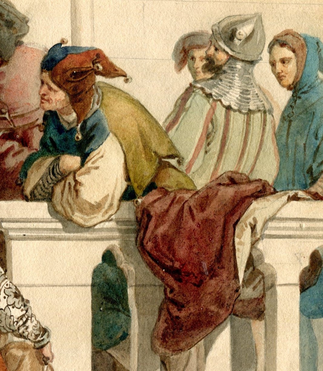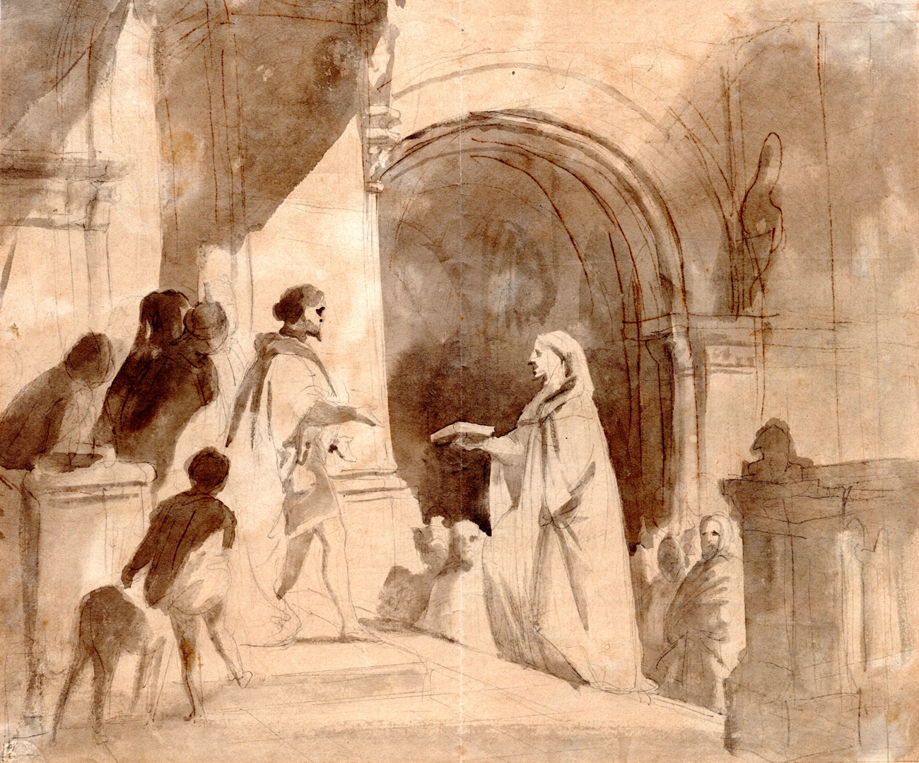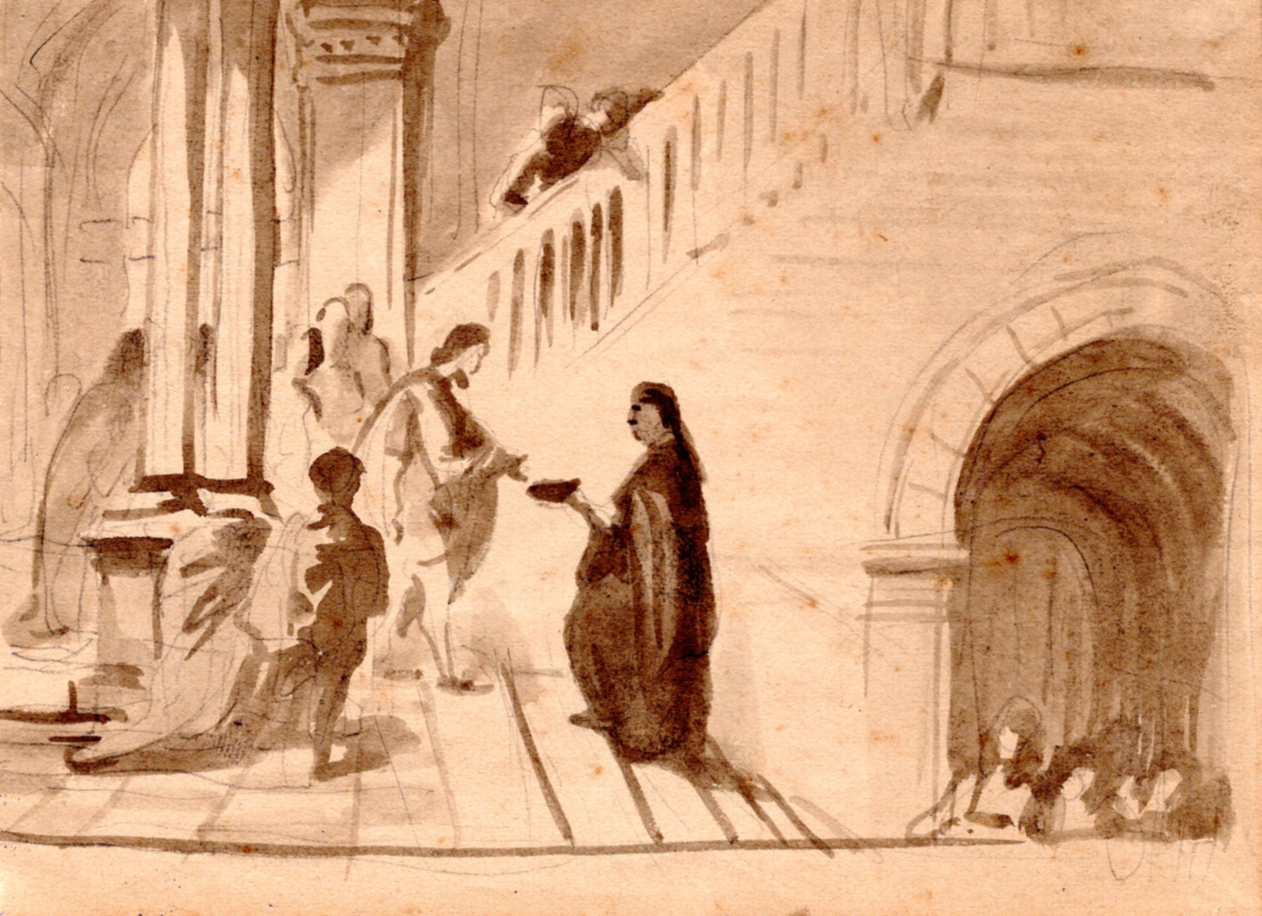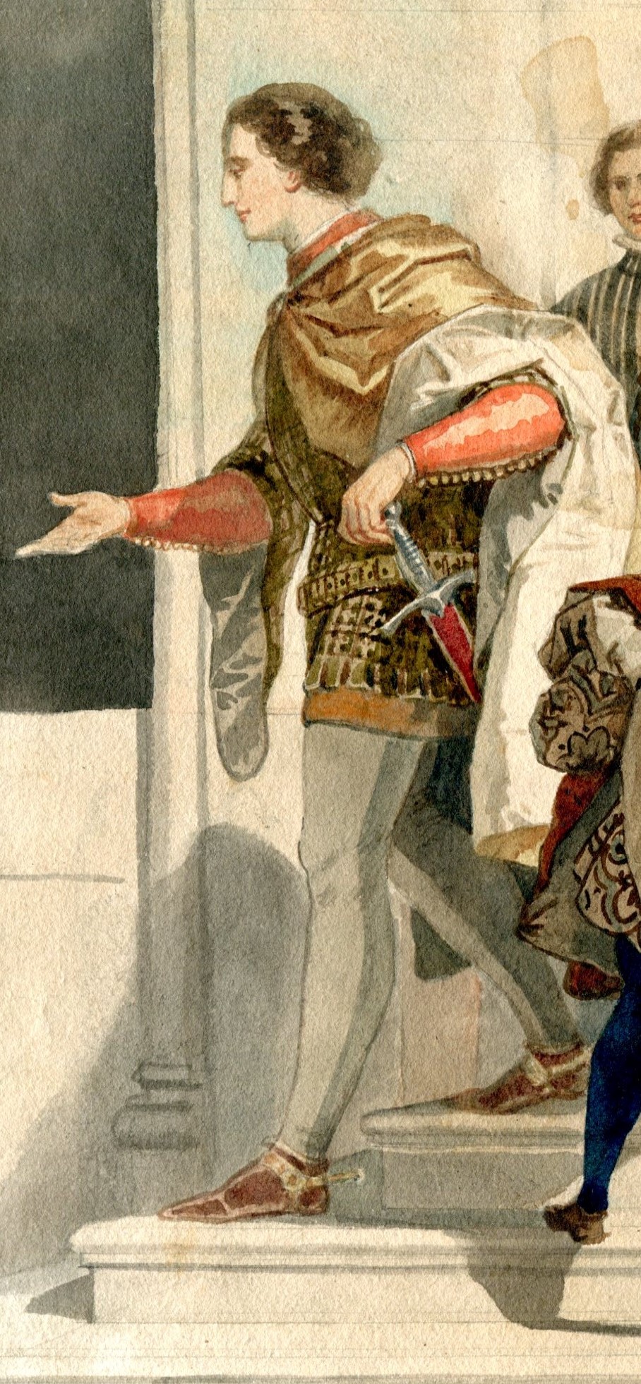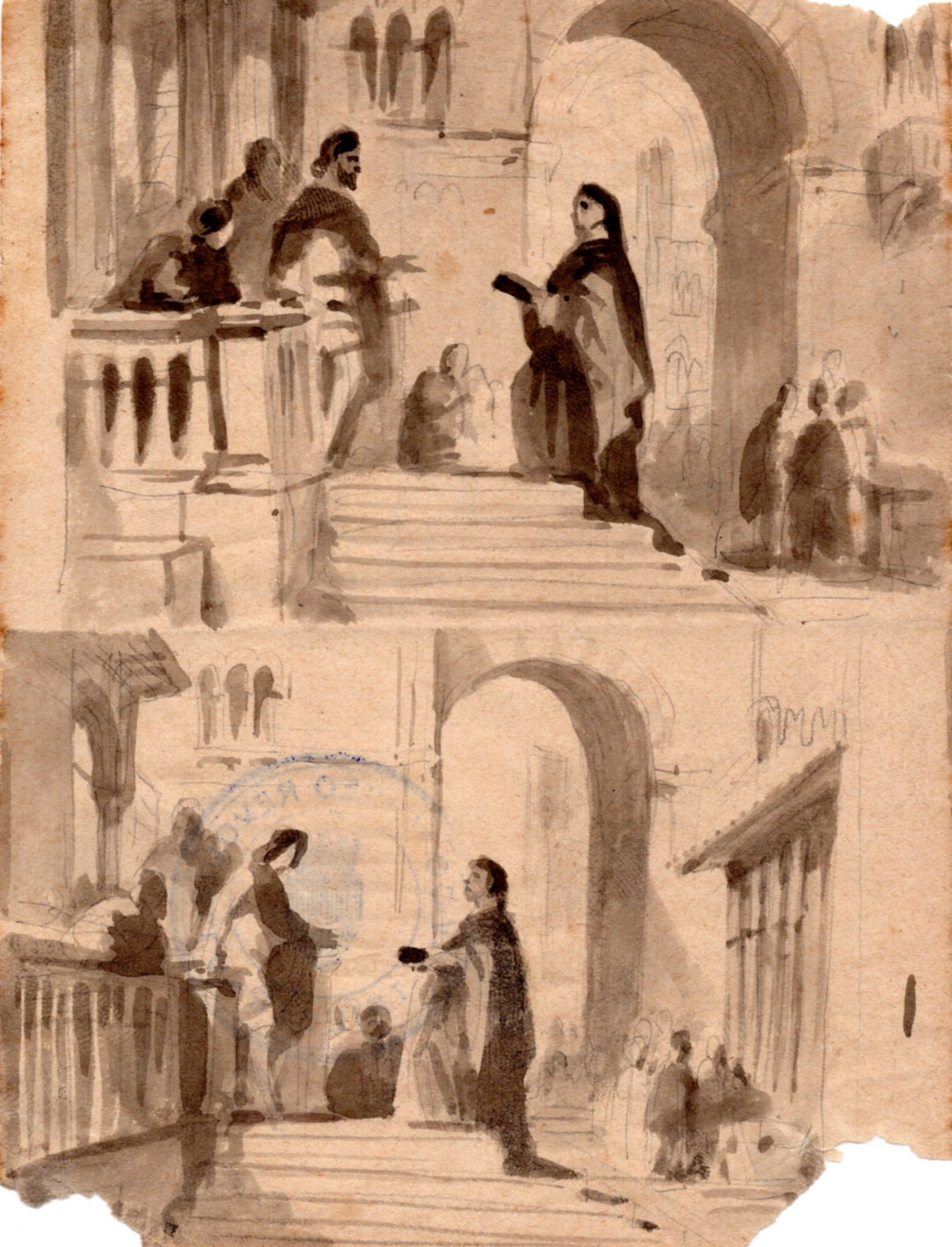 Giuseppe Lorenzo Gatteri, serie di bozzetti preparatori dell’acquerello finito centrale Dante consegna l’epistola a Cangrande della Scala. Inventari 196/3; 217/3; 213/19 e 217/1. Matita di grafite e acquerello grigio su carta bianca e su carta beige, legato Matilde Weber Gatteri, Trieste 1904.