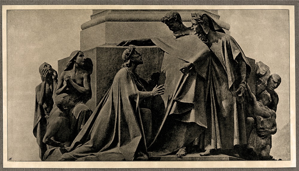 Il nome del Sommo Poeta si presta a essere utilizzato come strumento di rivendicazione dell’italianità soprattutto nelle città del Triveneto della seconda metà dell’Ottocento. Il complesso scultoreo dedicato a Dante, realizzato dallo scultore fiorentino Cesare Zocchi (1851-1922) nel 1896 a Trento, nasce in risposta al monumento del trovatore Walther von der Vogelweide (1170 ca.-1230 ca.), inaugurato a Bolzano nel 1889. Il Sommo Poeta è un simbolo dell’italianità di quelle terre ma, al contempo, sottende a logiche commerciali e imprenditoriali connesse alla nascente industria del turismo. La rappresentazione fotografica del monumento contribuisce a reclamizzare il volto italiano della città trentina. L’atelier del primo fotografo stabile trentino Giovanni Battista Unterveger (1833-1912), allievo del dagherrotipista Ferdinand Brosy (1805-?), effettua una sistematica campagna di documentazione del complesso dedicato a Dante che divulga in positivi sciolti e in album.