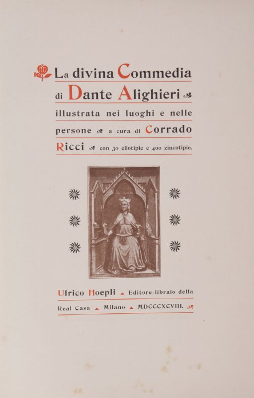 Corrado Ricci (1858-1934) cura nel 1898 la Divina Commedia illustrata nei luoghi e nelle persone corredata da 30 eliotipie e 400 zincotipie. Le fotografie realizzate da professionisti e dilettanti esplorano i luoghi danteschi. Ricci preferisce la fotografia perché ritenuta oggettiva, non fantasiosa e perché consente di ricreare le fonti di ispirazione del poeta.