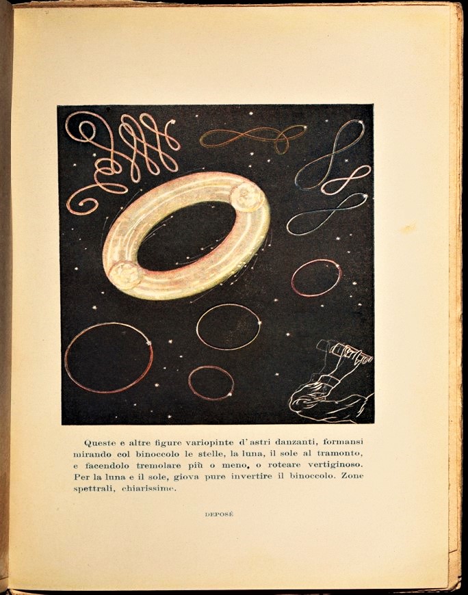 Poi premete sulle sopracciglia la parte somma degli oculari. Incominciate a far tremolare il binocolo, così aderente, sicché con esso ne vengano mosse le sopracciglia. Scostatelo e avvicinatelo agli occhi, sempre facendolo tremolare e battendolo sotto la fronte fino a dargli un moto rapidissimo, ondulatorio e quasi vertiginoso. Voi nel cielo della Luna osserverete una pioggia di brillanti gioielli, di topazii, uno sfavillare come festa d’anime beate».
