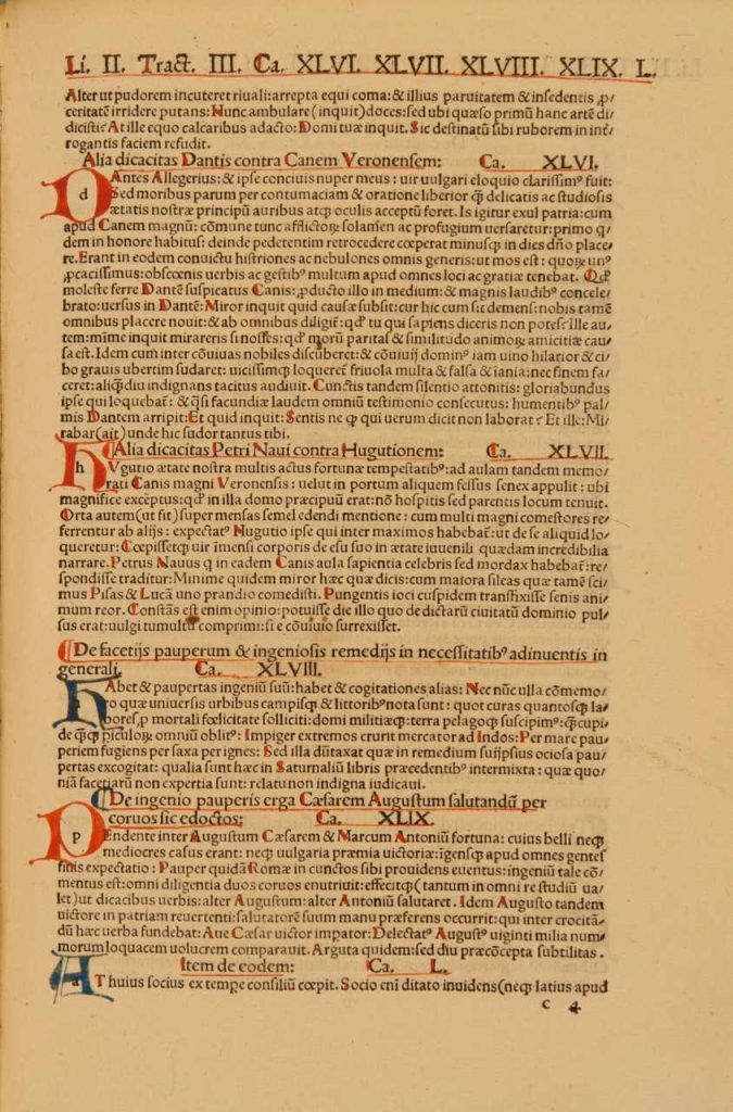 Petrarca aggiunge al ritratto di Dante esule, l’episodio in cui l’Alighieri siede alla tavola di una famiglia nobile: il padrone di casa già alticcio e piuttosto sudato per il pranzo abbondante che si protrae oltre il consueto, racconta sciocchezze, mentre Dante rimane in silenzio. L’ospite chiede allora la sua approvazione: “Non sai forse che chi dice il vero non si affatica?”, osservazione alla quale il poeta replica tagliente: “Ed io che mi stupivo da dove ti venisse tanto sudore”.