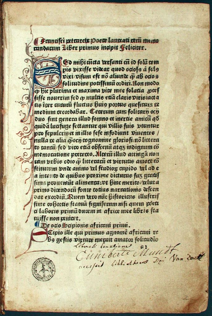 Francesco Petrarca inizia a comporre I libri dei fatti memorabili, noti con il titolo di Rerum memorandarum libri, in Provenza nel 1343 e li prosegue nel successivo soggiorno italiano. Li interrompe nel 1345, perché è costretto a fuggire da Parma assediata dalle truppe dei Visconti e dei Gonzaga. Giunto a Verona dopo una fuga avventurosa, Francesco dimentica a Parma il manoscritto e lascia l’opera incompiuta.