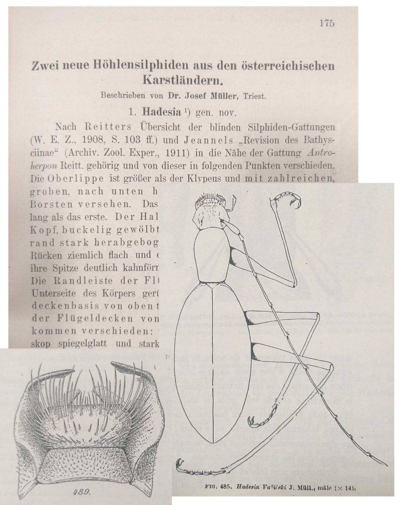 Al regno dell’Ade, o degli inferi (da Hades, personaggio della mitologia greca, sinonimo di Plutone nella mitologia romana), è dedicato Hadesia, genere balcanico di eccezionali coleotteri cavernicoli affini a Leptodirus e Spelaeodromus, con un apparato boccale filtratore per ricavare nutrimento dalle acque di stillicidio. A descriverlo con tale nome fu nel 1911 Giuseppe Müller, entomologo e pioniere della biospeleologia destinato successivamente a diventare conservatore e poi direttore del Museo di Storia Naturale di Trieste.