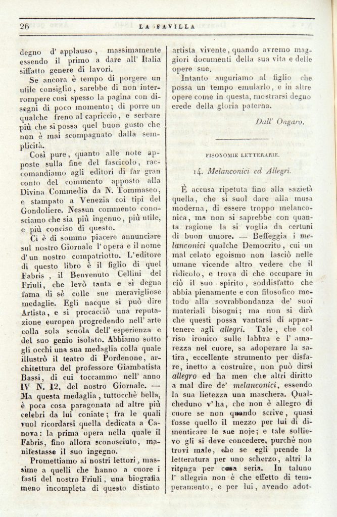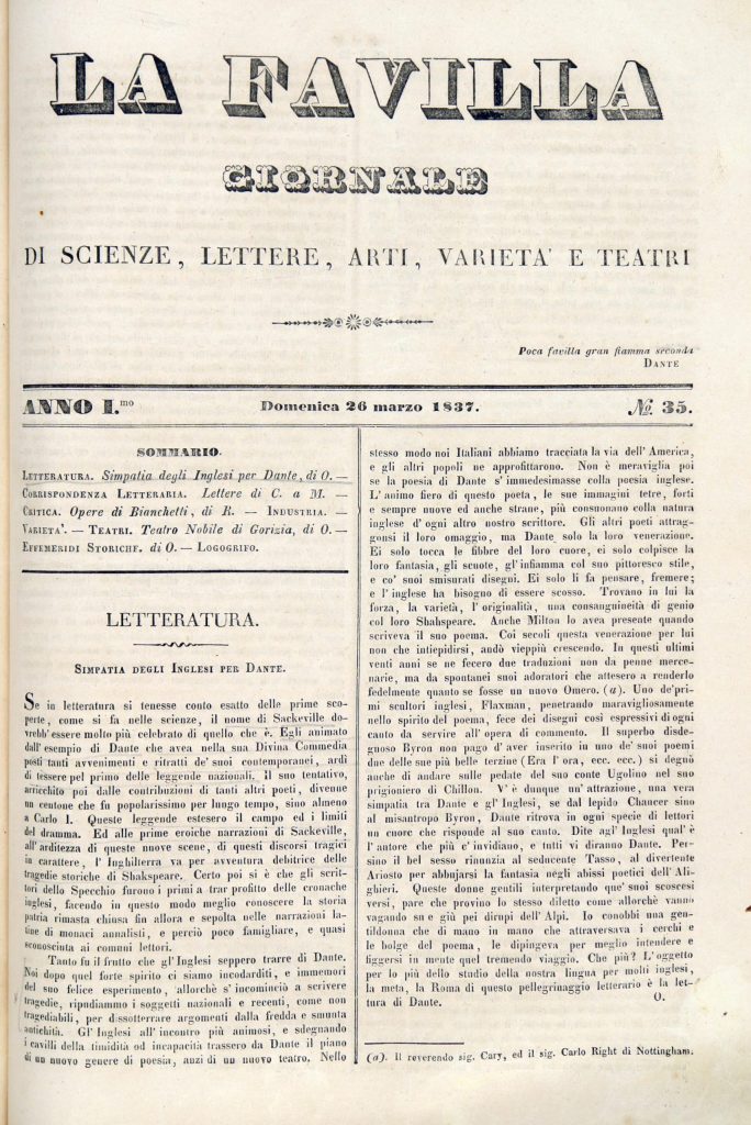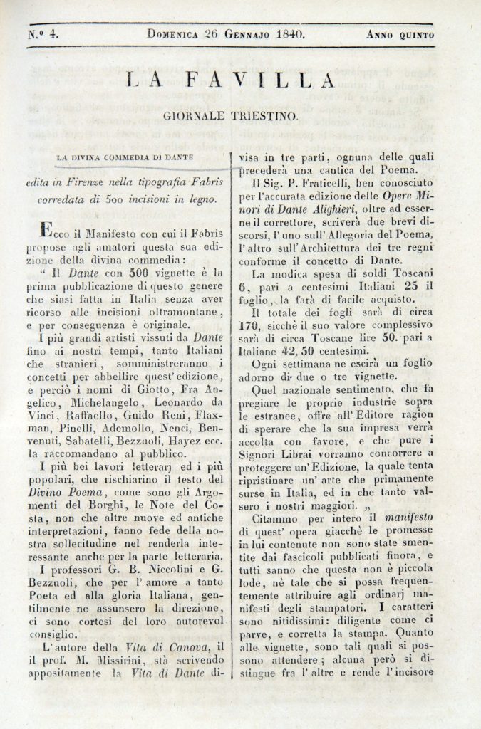 Francesco Dall’Ongaro La Divina Commedia di Dante edita in Firenze dalla Tipografia Fabris corredata da 500 incisioni in legno, in «La Favilla», 26 gennaio 1840