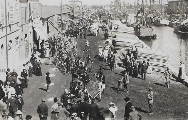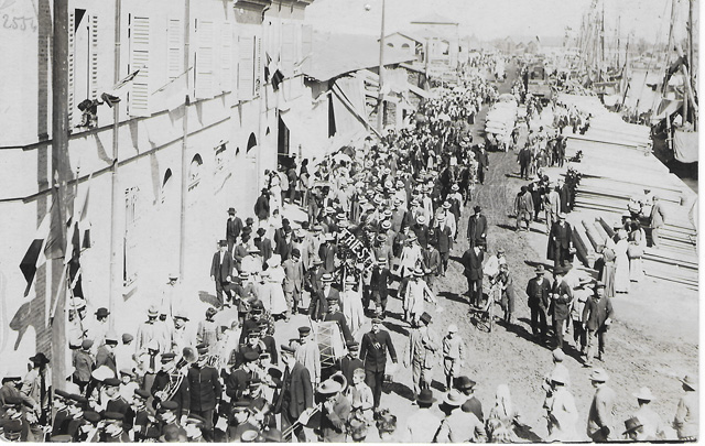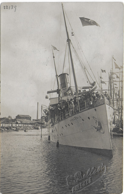 L’arrivo degli irredenti con l’ampolla dantesca è oggetto d’interesse da parte del fotografo fiorentino Ernesto Bellesi (fl. 1901-) che immortala l’arrivo del piroscafo Hungaria, partito da Trieste la sera prima per consentire a tutti di partecipare all’evento senza spese aggiuntive di albergo. Il piroscafo è infatti dotato di cento cuccette che sono prioritariamente assicurate alle signore al prezzo di 3 corone a/r. Gustavo Cesca dona il positivo ai musei il 2 luglio 1935.