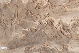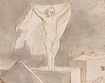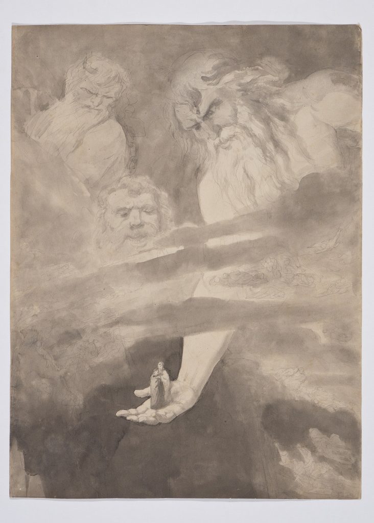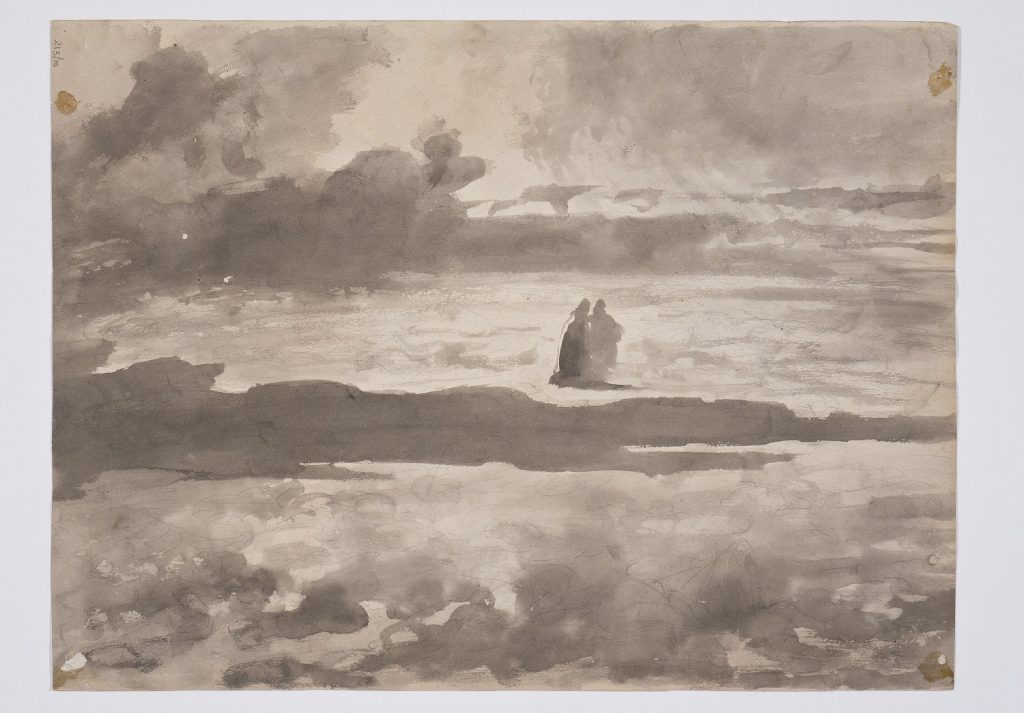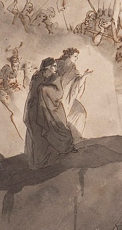 E che dire infine della magnifica resa minimalista e incredibilmente attuale dell’acquerello in cui Dante e Virgilio ci appaiono come ombre impalpabili, desolatamente sospese in un paesaggio surreale (FIG. 6 verso). Sul recto del disegno vediamo il gigante Anteo (FIG. 6 recto), affiancato dagli altri due giganti Fialte e Briareo, mentre depone Dante e Virgilio sul fondo gelato del lago Cocito, descritto nel XXXI Canto.