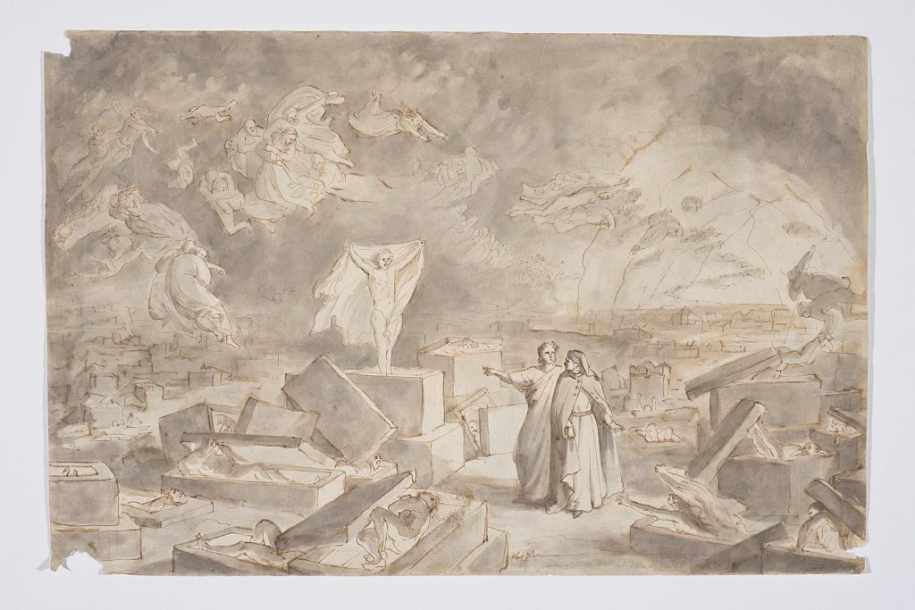“Volgiti! Che fai? Vedi là Farinata che s’è dritto” – riporta Gatteri sul verso del disegno acquerellato che interpreta il famoso episodio dell’incontro di Dante e Virgilio con Farinata degli Uberti, nel sesto cerchio (Canto X), in cui sono relegati gli eretici e, tra questi, gli epicurei o “negatori dell’immortalità dell’anima”. Tra questi spicca il grande capo ghibellino Farinata, nemico valoroso e rispettabile, politicamente contrapposto a Dante di parte guelfa. “[…] ed el s’ergea col petto e con la fronte / com’avesse l’inferno in gran dispitto.”