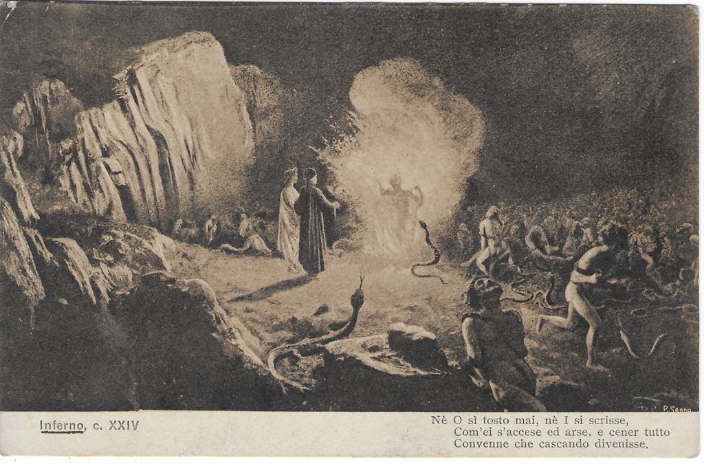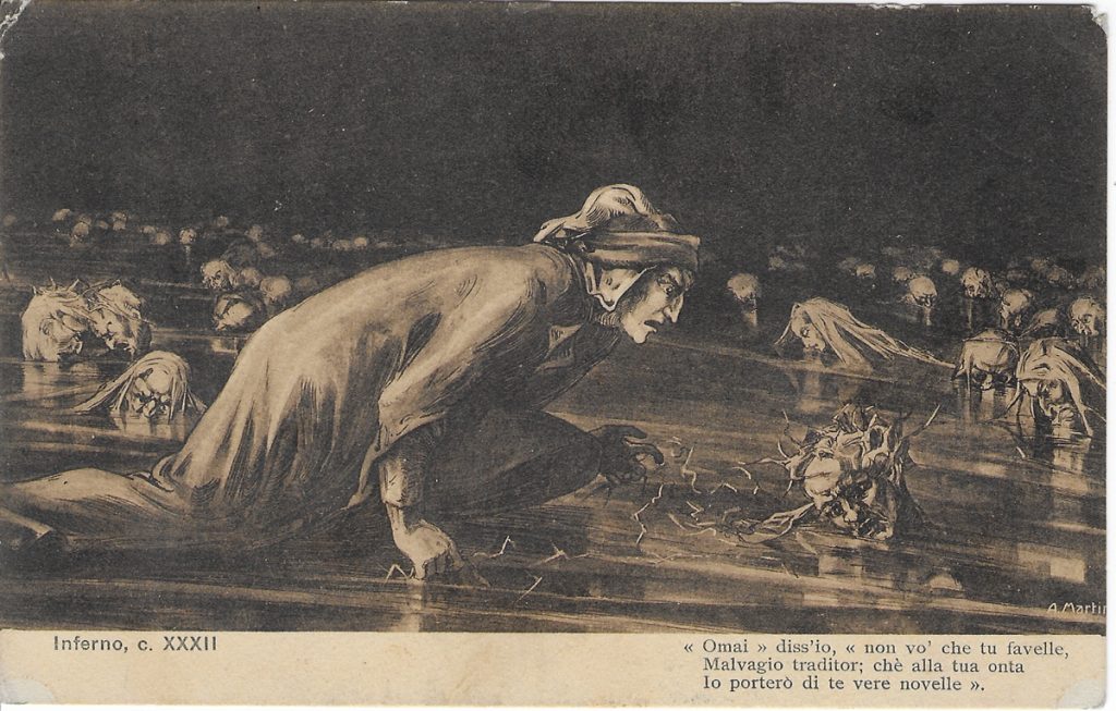 L’altra cartolina riproduce il passo presente nel XXXII canto dell’Inferno, dedicato a Bocca degli Abati, il traditore dei fiorentini guelfi a Monteaperti relegato nel Cocito, il lago di ghiaccio destinato ai traditori.