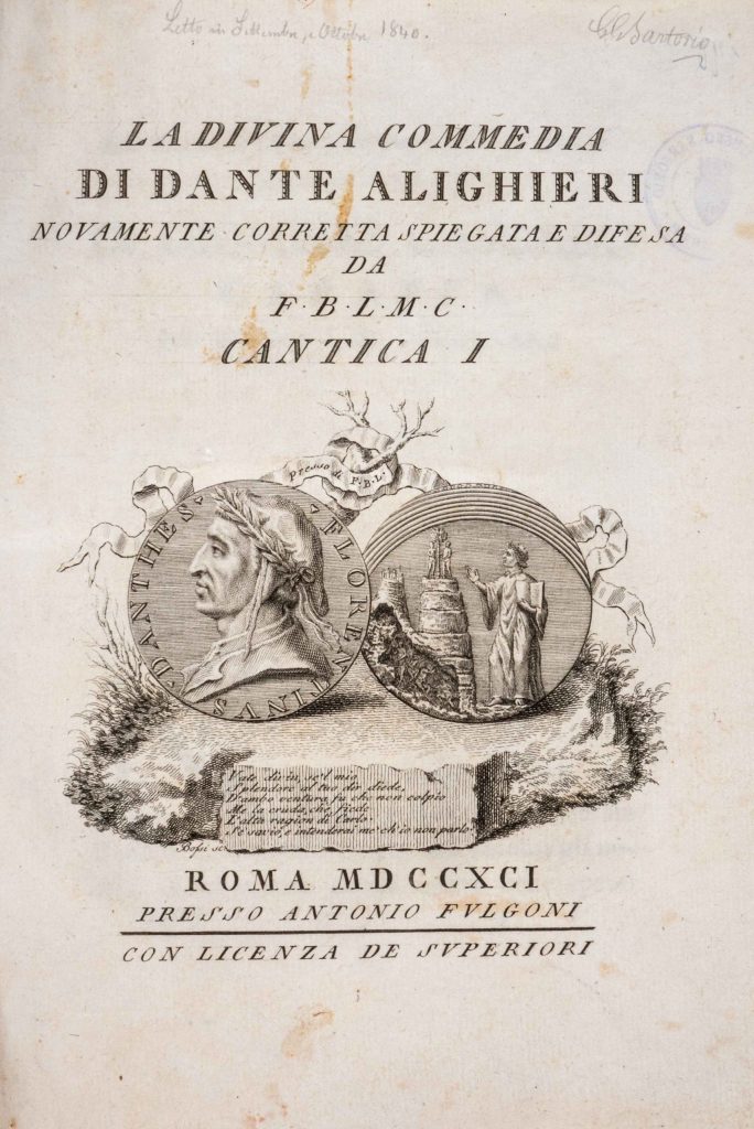 La settecentina, commentata da Francesco Bonaventura Lombardi (1718-1802), è l’edizione preferita. Sottolineata in diversi punti, è contrassegnata dall’annotazione autografa “Letto in Settembre e Ottobre 1840, G.G. Sartorio”e da diverse sottolineature e postille corredate dalla sigla NB.