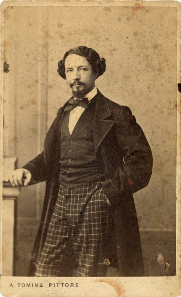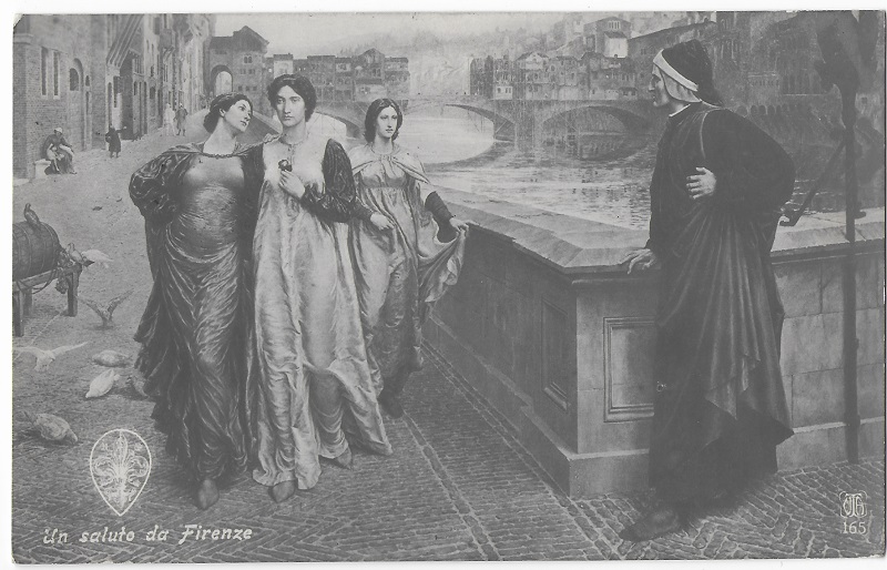 A partire dall’esplorazione e dalla diffusione del tema della Divina Commedia di artisti come Flaxman, il mito di Dante in veste di eroe nazionale ha un’ampia circolazione, soprattutto in fotografia. Le immagini poste in vendita in formati diversi divulgano il patrimonio artistico e naturale per favorire l’educazione degli italiani e promuovere la conoscenza dell’Italia. Non sono conservate in Fototeca cartoline tratte dall’opera dell’artista ma è presente quella tratta dal quadro di un altro pittore londinese. Si tratta di Dante incontra Beatrice al Ponte di Santa Trinità del pittore Henry Holiday (Londra 1839-1927): realizzato nel 1883, è oggi custodito alla Walker Art Gallery di Liverpool. Anche Holiday dipinge il quadro dopo un soggiorno fiorentino che gli consente di descrivere la città in modo accurato.