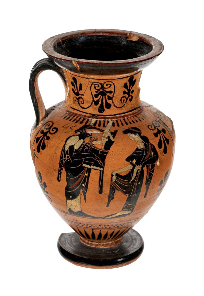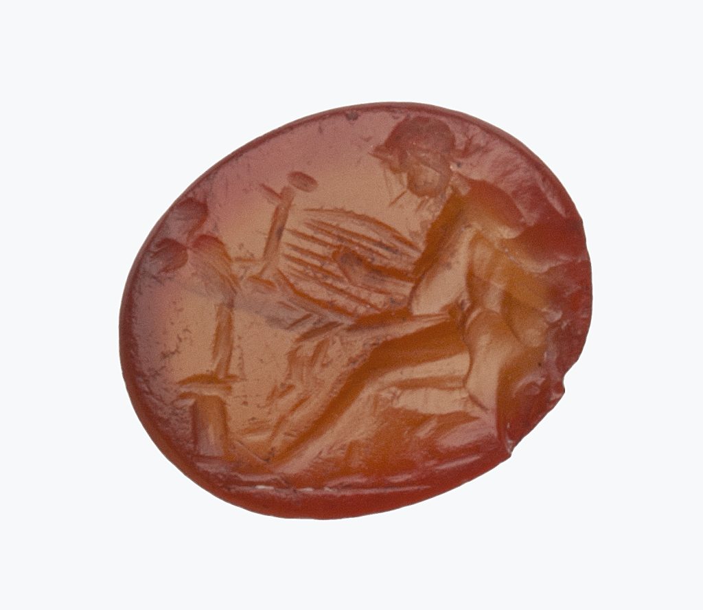 Nella ricca raccolta di gemme incise (da anelli, ciondoli o altro tipo di gioielli) del Museo una piccola corniola arancione ha incisa una figura di uomo nudo visto di profilo rivolto verso destra, seduto con una gamba distesa e l’altra leggermente flessa, che con una mano suona la cetra e con l’altra tiene un oggetto, forse una corona con lunghe bende. Davanti a lui è una colonnina su cui poggia un idolo. Due possono essere le interpretazioni di un personaggio che suona la cetra: il dio Apollo o Orfeo, che in genere però è vestito e affiancato da animali.