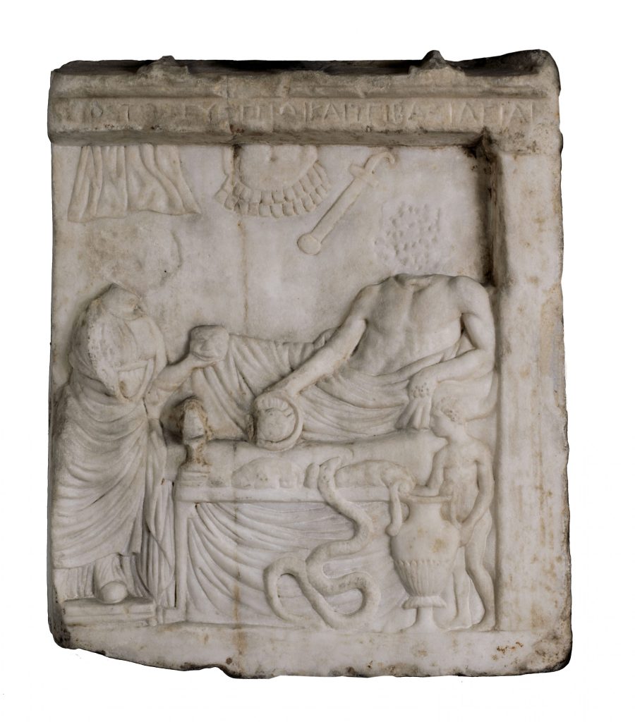 La stele, purtroppo frammentaria e con i personaggi ora privi della testa, raffigura un banchetto funebre con l’eroe steso su una kline (letto triclinare, usato nei banchetti) che riceve le offerte (tutti gli oggetti in mano ai personaggi come anche alcune lettere dell’iscrizione sono stati rilavorati nel primo Ottocento).