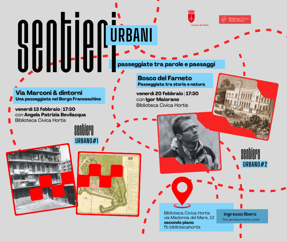 Il primo appuntamento è in programma venerdì 13 febbraio alle ore 17.30 con Via Marconi & dintorni. Una passeggiata nel Borgo Franceschino, un itinerario alla scoperta delle trasformazioni che hanno segnato nel tempo questo settore della città. Partendo dalle suggestioni di Strade e rive di Trieste di Biagio Marin, guida sentimentale attenta anche ai luoghi meno celebrati, l’incontro ripercorre l’area compresa tra il Coroneo e il Giardino pubblico, attraverso le tracce del suo vissuto umano e naturale. L’incontro sarà condotto da Angela Patrizia Bevilacqua, bibliotecaria della Hortis, che accompagnerà il pubblico tra fonti letterarie e risorse documentarie custodite presso la Biblioteca civica e altre collezioni.